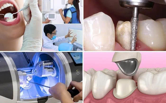 Bác sĩ mài một lớp men răng mỏng để tạo hình cho mão sứ. Sau đó lấy dấu răng gửi labo chế tác. Trong thời gian chờ, khách hàng được gắn răng tạm để đảm bảo thẩm mỹ và ăn nhai.