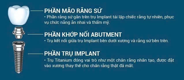 Cấy ghép Implant (hay cắm Implant) là phương pháp dùng một trụ chân răng nhân tạo bằng Titanium đặt vào trong xương hàm tại vị trí răng đã mất. Trụ chân răng này sẽ thay thế chân răng thật, sau đó dùng răng sứ gắn lên trụ răng Implant tạo thành răng hoàn chỉnh.