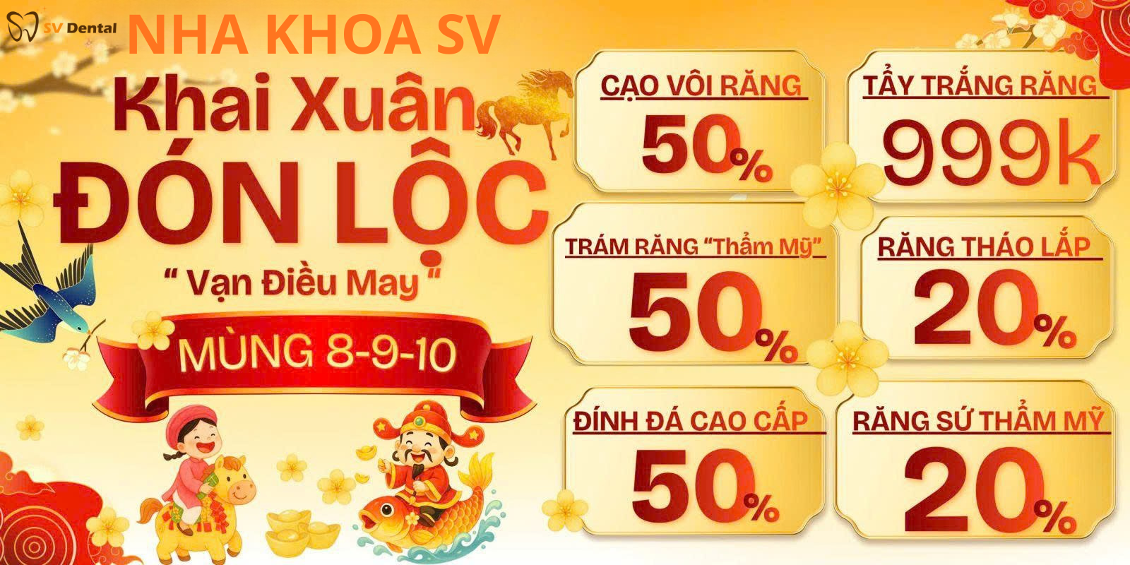 Nhân dịp Khai Xuân Đón Lộc, Nha Khoa SV triển khai chương trình ưu đãi đặc biệt trong các ngày mùng 8 – 9 – 10 âm lịch dành cho khách hàng tại TP.HCM và khu vực lân cận.
